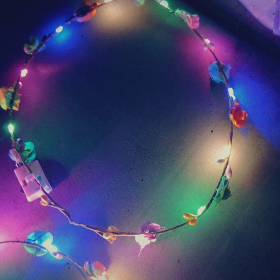Light up your festival vibes with the Electric Flower Halo! This adjustable halo is decked out with colorful flowers and bright lights that switch from steady glow to fast or slow flashes. Customize your look and shine bright all night long—perfect for dancing, selfies, and making memories under the festival lights.